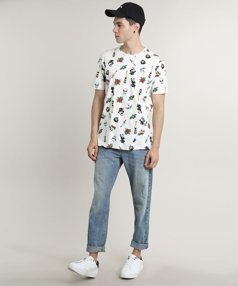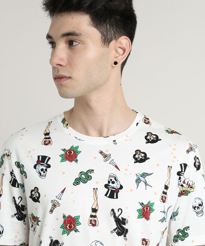 Camiseta Masculina Estampada Tatuagens Manga Curta Gola Careca Off White
